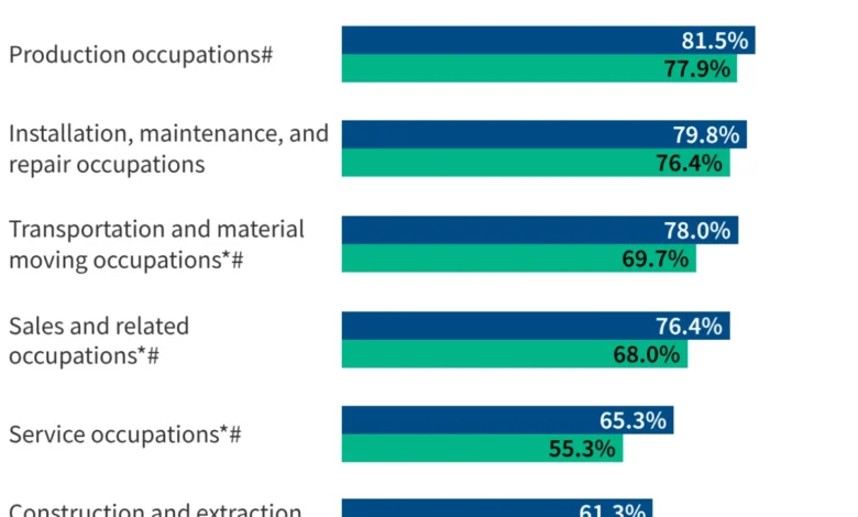 Access to ESI is further shaped by employer offer rates and employee eligibility. In March 2025, approximately 80.4% of adult workers under 65 were employed by a firm that offered ESI to at least some employees, and 92.8% of these workers were eligible for the offered coverage. Overall, about three-quarters of all workers were eligible. However, these rates vary dramatically by firm size and occupation. Firms with 200 or more employees boast nearly universal offer rates (97%), covering 69% of the workforce. In contrast, only 51% of firms with 10 to 24 workers offer benefits, representing a significant barrier for employees at smaller businesses. Workers in occupations such as construction, service, sales, and farm, fishing, and forestry-related roles are consistently less likely to be offered or eligible for ESI, as are part-time workers.